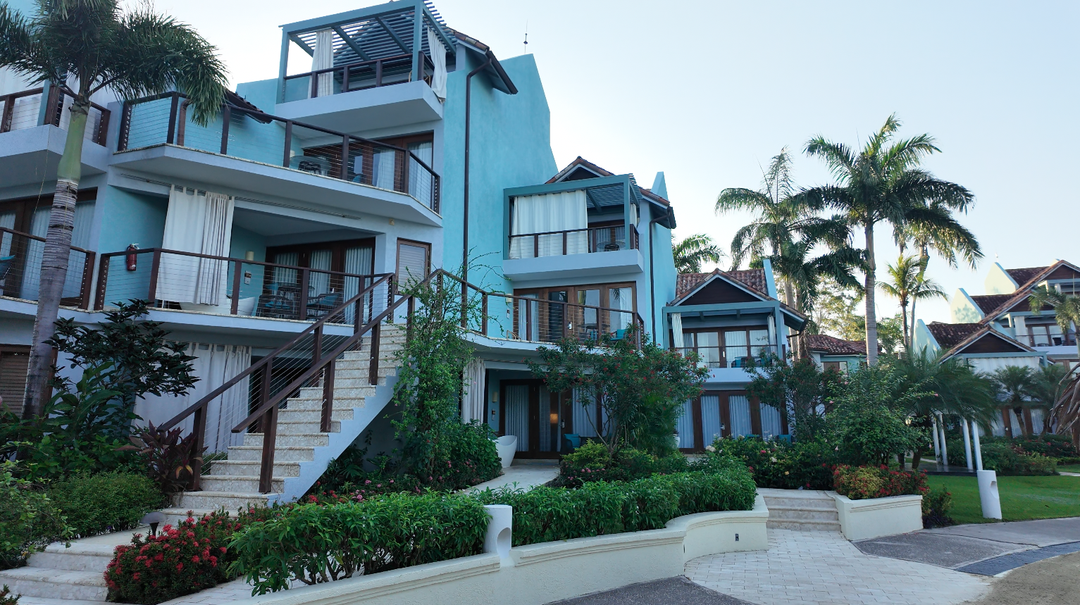 In contrast to the buildings we’ve looked at so far, half of the rooms here are on the backside and face the garden. These are all luxury level and come with a lower price tag. All rooms that face the ocean are going to be club level. The ground floor club-level rooms are walkout and the floors above that all have a balcony facing the ocean.