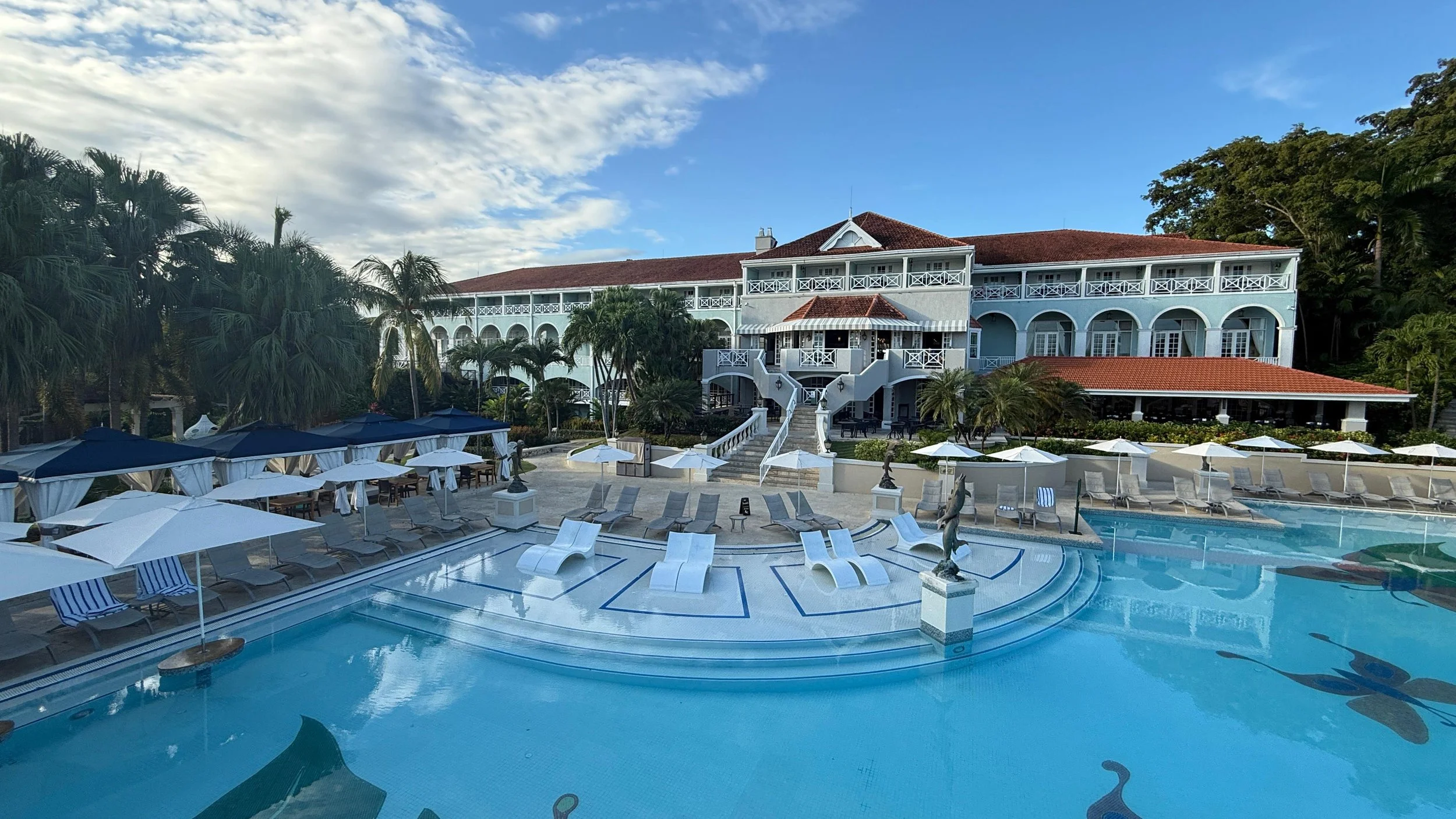 Sandals markets 105 pools and 22 whirlpools at Ochi. That number includes the in-suite plunge pools at the villas, so don't picture 105 separate public pools. In practice, there are several main public pools (the big Beach Club pool, Great House pool, Riviera pools), three swim-up bars, and a long list of private villa plunge pools.